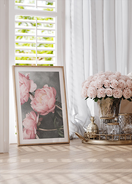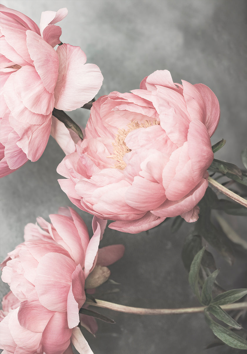 Esta elegante fotografía floral captura peonías de color rosa suave en plena floración, con delicados pétalos desplegados con elegante detalle. El fondo apagado acentúa los románticos colores pastel y crea una obra de arte botánica atemporal que irradia belleza, frescura y sofisticación natural.