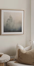 Åsmund Kværnstrøm indfanger en stille, nordisk vintermorgen. Tætte træer står som silhuetter i tåge og fin sne, mens frostens matte skær blødgør skovens konturer. Den maleriske tekstur og kolde farveskala skaber en poetisk ro, der inviterer til fordybelse og stille eftertanke. Et stille vinterlandskab i dis og sne.