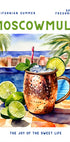 Este animado cartel muestra una refrescante mula de Moscú servida en una taza de cobre, acompañada de limas frescas y una piscina al fondo. Con colores fuertes y un ambiente veraniego, captura la alegría de los cítricos, la frescura y la relajación: una obra de arte perfecta para cocinas, bares o paredes con cuadros inspirados en el verano.