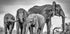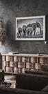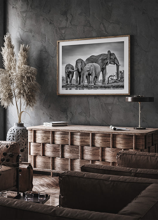 Esta poderosa fotografía de vida silvestre en blanco y negro muestra una familia de elefantes reunida en un abrevadero. Presenta tiernas interacciones entre elefantes jóvenes y adultos y refleja temas de protección, unidad y majestuosidad de la naturaleza: una obra de arte atemporal que celebra la fuerza, la familia y la naturaleza.