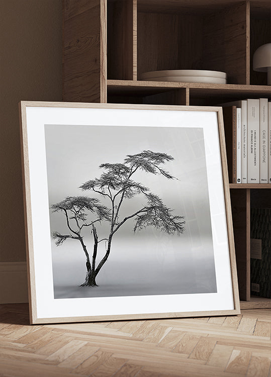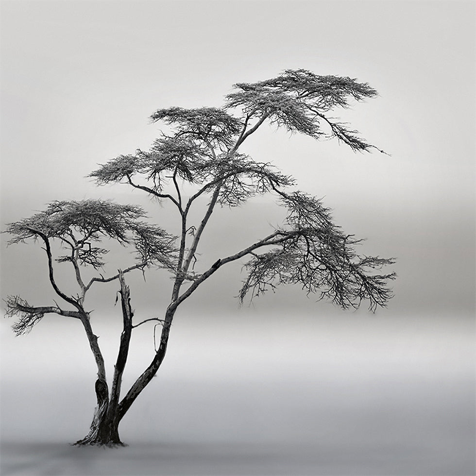 Un árbol solitario se recorta en la densa niebla sobre la sabana en Naivasha, Kenia. El ambiente monocromático captura el silencio, la profundidad y el paisaje abierto, donde el tiempo y la distancia se fusionan. La fotografía "una historia muy larga" fue creada por Piet Flour y rezuma calma, poesía y reflexión. Una imagen de añoranza, espacio y horizonte infinito.