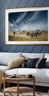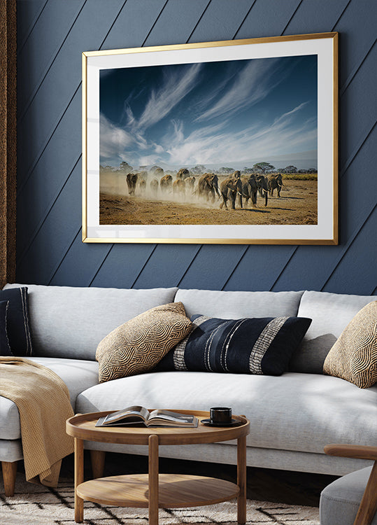 Esta poderosa fotografía de vida silvestre captura una majestuosa manada de elefantes cargando a través de la sabana polvorienta bajo un cielo amplio. Exudando fuerza bruta, unidad y el espíritu salvaje de África, la escena se convierte en una magnífica obra de arte que celebra la naturaleza, la libertad y el esplendor de la naturaleza.