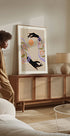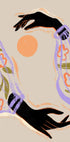 Una ilustración figurativa moderna de dos manos negras que se acercan a un sol naranja brillante. Los brazos están adornados con mangas florales en suaves pasteles, creando una mezcla poética de belleza botánica y minimalismo abstracto. La obra simboliza armonía, energía y conexión con la naturaleza.