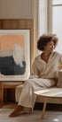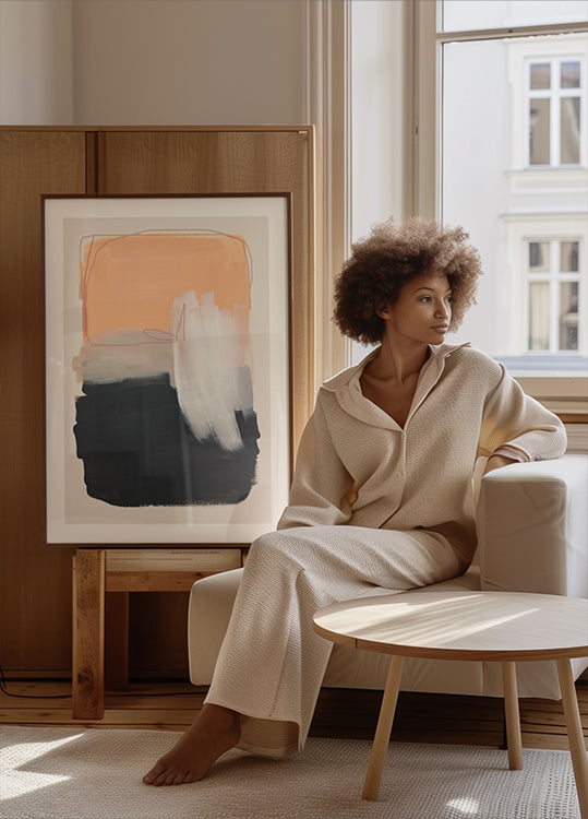 Un póster abstracto moderno con pinceladas atrevidas en melocotón cálido, gris en capas, negro intenso y un toque de blanco suave. Los trazos texturizados y los tonos contrastantes crean una sorprendente composición que equilibra calidez y profundidad, perfecta para interiores minimalistas, decoración escandinava o elegantes paredes de galería.