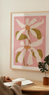 Esta moderna obra de arte floral abstracta presenta elegantes flores blancas con pétalos suaves y hojas de color verde terroso sobre un cálido fondo rosa pastel. Minimalista pero expresiva, la obra une la belleza botánica con la ilustración moderna, añadiendo frescura y encanto a cualquier interior.