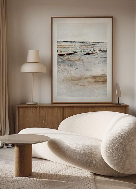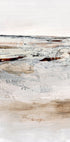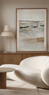 Una pintura costera abstracta y tranquila de Dan Hobday, con texturas en capas y pinceladas suaves en tonos terrosos de beige, blanco y toques de óxido. La composición pictórica minimalista evoca la sensación de los horizontes costeros y combina la abstracción moderna con la tranquilidad natural. Una pieza perfecta para interiores modernos con estética costera o minimalista.