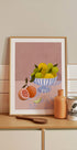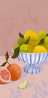 Una encantadora ilustración de bodegón de un cuenco a rayas lleno de limones y limas, acompañado de una naranja sanguina en rodajas y una rodaja de lima. Con tonos cálidos y texturas pintorescas, esta obra de arte aporta un ambiente fresco de inspiración mediterránea, perfecta para una cocina o un comedor.