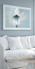 Una delicada fotografía macro de una flor blanca con detalles en tonos turquesa que crean un ambiente etéreo y de ensueño. El enfoque suave y los colores pastel evocan calma y elegancia, haciendo que la obra sea ideal para interiores que buscan armonía y belleza refinada.
