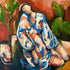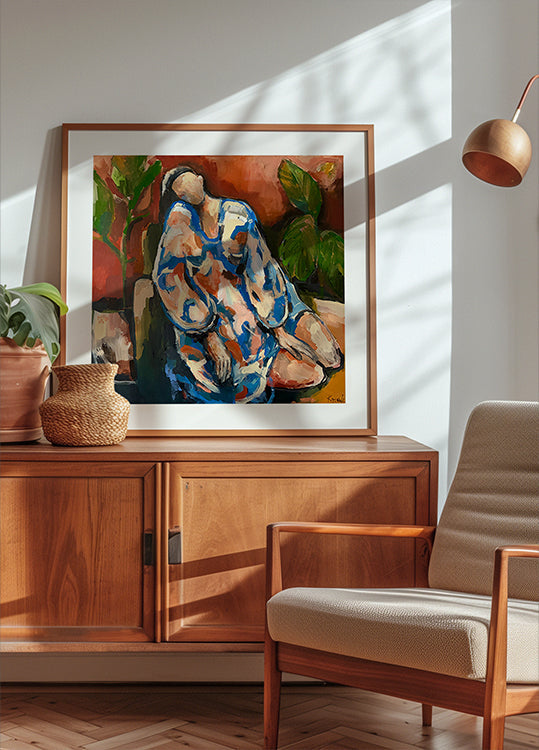 Una composición moderna y figurativa en tonos azules y verdes profundos muestra a una mujer pensativa rodeada de exuberantes plantas. La mirada y la silueta crean calma y presencia, mientras que las formas abstractas aportan energía y movimiento. "Alice" de Magdalena Krzak es una mirada poética a un momento de tranquilidad que eleva tanto la sala de estar como la galería.