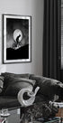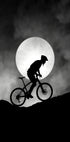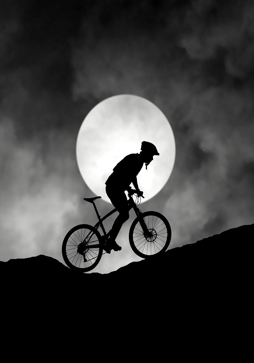 Una poderosa silueta en blanco y negro de un ciclista subiendo una colina bajo una brillante luna llena. El dramático contraste entre luces y sombras crea una escena surrealista y aventurera que captura la emoción de la conducción nocturna, la determinación y la resistencia con el telón de fondo de la naturaleza.
