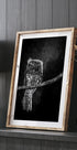 Una llamativa fotografía en blanco y negro de un búho posado en una rama, con ojos penetrantes y llenos de misterio. Los tonos monocromáticos resaltan cada pluma y sombra, creando un dramático retrato discreto que encarna la esencia de la vida silvestre, la noche y el espíritu salvaje de la naturaleza.