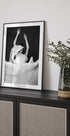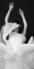 Un impactante retrato en blanco y negro de una mujer con un escultural vestido plisado, capturado en medio movimiento. Los dramáticos pliegues y la tela fluida crean una sensación de ritmo y elegancia, que recuerda tanto a la danza como a la escultura abstracta. Una atrevida obra de arte monocromática que mezcla moda, movimiento y arte.