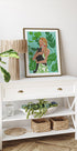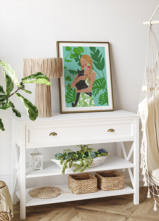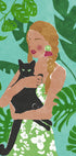 Una animada ilustración de una mujer sosteniendo un gato negro, rodeada de exuberantes hojas de monstera. Los colores fuertes y la estética tropical brindan una expresión cálida y moderna, ideal para los amantes de los gatos y los interiores botánicos.