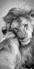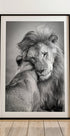 Un conmovedor póster de vida silvestre en blanco y negro que muestra un león y una leona en un tierno abrazo. Capturada en el Serengeti de Tanzania, esta obra de arte simboliza el amor, la fuerza y la devoción en la naturaleza. Perfecto para naturaleza, animales e interiores románticos.