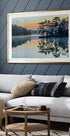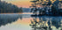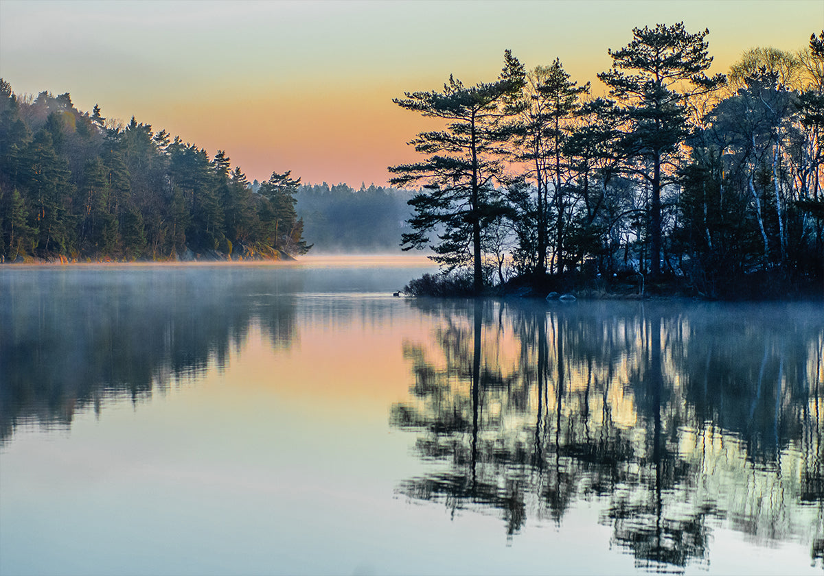 Una tranquila escena de un lago al amanecer, capturada en Suecia con niebla elevándose sobre el agua tranquila. El reflejo de los pinos brilla bajo la suave luz del sol y crea una atmósfera tranquila y meditativa llena de paz y armonía.