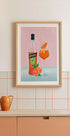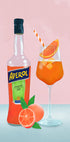 Una ilustración fresca y animada de Aperol Spritz, con una botella, cítricos y una copa de cóctel con guarnición de hielo y naranja sobre un fondo rosa suave. Legendaria y colorida, esta obra de arte captura la esencia del verano italiano y la cultura del aperitivo, perfecta para cocinas, bares y espacios sociales.