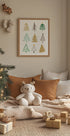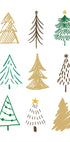Una ilustración minimalista moderna con una colección de diseños abstractos de árboles de Navidad en verde, dorado y marrón. Cada árbol tiene un estilo único dibujado a mano, perfecto para decoraciones navideñas y arte mural festivo.