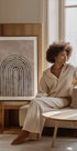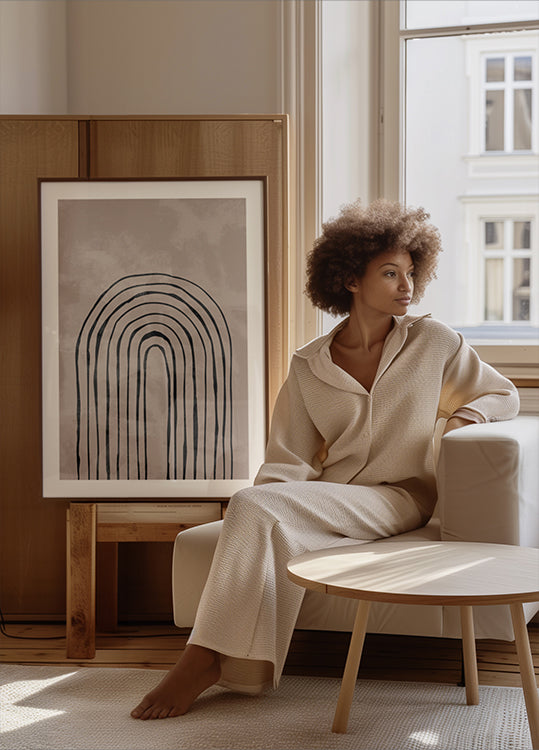 Motivo gráfico y minimalista con arcos negros que se elevan en capas rítmicas sobre un cálido fondo beige. La clara simetría y el contraste entre la luz y la oscuridad crean calma, profundidad y dirección. Un punto focal atemporal que añade equilibrio al salón, al recibidor o a la oficina en casa. Encaja perfectamente en habitaciones nórdicas, modernas y de inspiración japonesa.