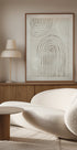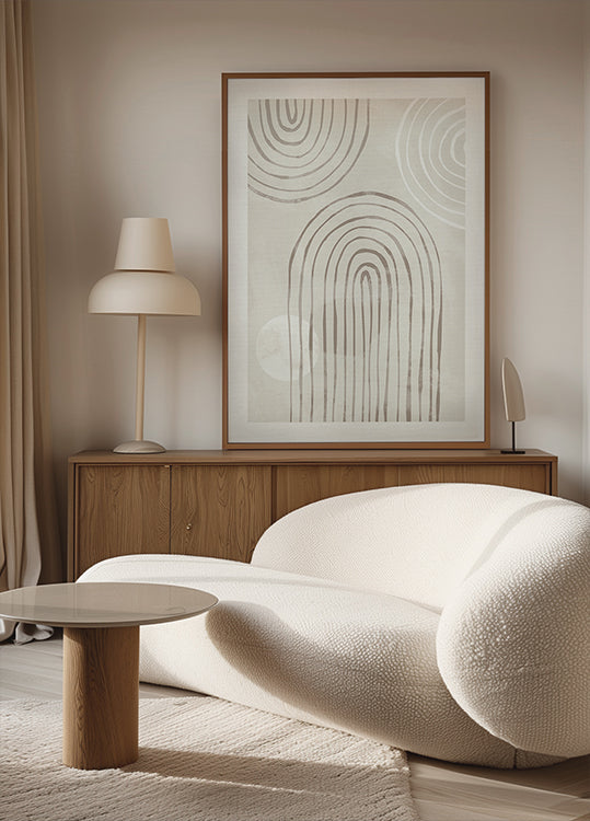 Un póster abstracto dibujado a mano con líneas curvas orgánicas y patrones circulares en suaves tonos beige. La geometría fluida e imperfecta añade calidez y textura, y le da a la obra de arte un toque natural y artístico. Perfecto para interiores minimalistas, de inspiración japonesa y escandinava.