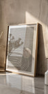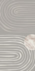 Un póster abstracto minimalista con patrones de líneas arqueadas fluidas en beige suave sobre un fondo gris apagado, resaltado por un círculo texturizado. La geometría orgánica da una expresión tranquila y equilibrada, ideal para interiores japoneses, nórdicos o minimalistas modernos.
