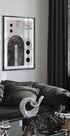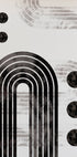 Un llamativo póster abstracto con atrevidos arcos negros, formas circulares y líneas geométricas en capas sobre un fondo de textura clara. La paleta monocromática enfatiza la simetría y el equilibrio, lo que la convierte en una declaración elegante en interiores modernos, japoneses o de inspiración escandinava.