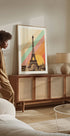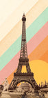 Una llamativa ilustración de inspiración retro de la Torre Eiffel en París, sobre un fondo audaz con rayas de arcoíris y un cálido sol dorado. La combinación de fotografía antigua y diseño gráfico vibrante crea una obra de arte nostálgica pero moderna inspirada en viajes, perfecta para los amantes de París, la arquitectura y la colorida decoración de paredes.
