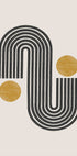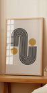 Un diseño abstracto minimalista moderno con líneas curvas negras atrevidas que forman arcos combinados con formas circulares doradas sobre un fondo simple. Combinando la estética retro de mediados de siglo con el estilo contemporáneo, esta obra de arte geométrica es una declaración perfecta para interiores modernos.