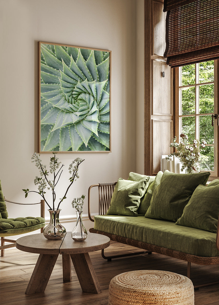 El póster muestra un primer plano de una planta de aloe vera con una estructura espiral de hojas verdes. Las hojas puntiagudas irradian desde el centro, creando un patrón visual que resalta la simetría y textura naturales de la planta. Los colores son suaves y tenues, creando una expresión serena y orgánica.