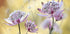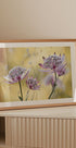 Un delicado póster en primer plano de las flores de Astrantia Major en suaves tonos rosados sobre un cálido fondo dorado. La perspectiva macro resalta los intrincados pétalos y las densas inflorescencias, creando una obra de arte botánica de ensueño que trae el encanto de la naturaleza al hogar.