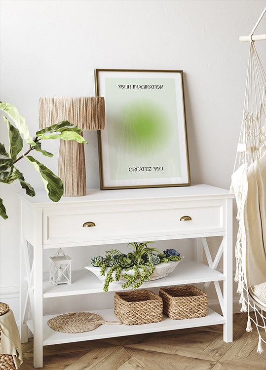 Un póster minimalista y relajante con el texto "Tu imaginación te crea" en tipografía artística y audaz. Un aura verde claro irradia desde el centro, simbolizando la creatividad y el desarrollo personal. El suave fondo verde pastel realza la atmósfera serena e inspiradora, ideal para espacios creativos o entornos de desarrollo personal.