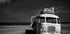 Una evocadora fotografía en blanco y negro de un autobús antiguo abandonado varado en una playa de arena. Con maletas gastadas apiladas en el techo y el mar de fondo, la imagen expresa viajes abandonados, decadencia y el paso del tiempo.