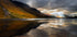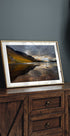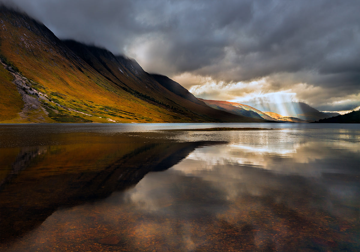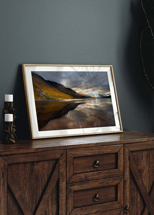 Un impresionante póster de paisaje de Glencoe, Escocia, donde se abren espectaculares nubes y los rayos de sol caen sobre las tierras altas y el lago. El agua tranquila refleja las escarpadas montañas y crea una composición poderosa pero pacífica que captura la armonía y el silencio de la naturaleza.