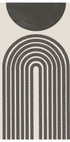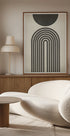 Un estampado abstracto minimalista inspirado en el estilo de mediados de siglo con atrevidos arcos negros que se extienden hacia un círculo negro sólido. La simplicidad geométrica de las líneas y el equilibrio circular hacen de esta obra de arte una pieza llamativa de decoración de pared moderna.