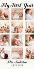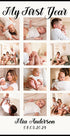 Un bonito póster personalizado para bebé que celebra el primer año de vida de tu pequeño. Esta impresión de collage de fotografías captura doce recuerdos preciosos, desde momentos de recién nacido hasta hitos tempranos. Un recuerdo atemporal y el regalo perfecto para padres, abuelos o decoración de guardería.