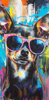 Un vibrante retrato de arte pop callejero de un chihuahua con gafas de sol de colores, pintado con atrevidos trazos inspirados en graffiti. Esta obra de arte divertida y moderna combina humor, estilo y energía urbana para agregar un ambiente divertido y vanguardista a cualquier espacio.