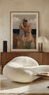 Una interpretación moderna de un bañista sentado en la playa: una figura femenina formada por superficies geométricas y pinceladas expresivas. La obra de Tore Bahnson une formas cubistas con calma emocional y una atmósfera atemporal y bañada por el sol. Perfecto como punto de atracción tanto en hogares modernos como en galerías y entornos artísticos.