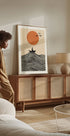 Una ilustración minimalista de una figura solitaria en un pequeño bote flotando sobre ondulantes olas negras bajo un sol anaranjado. Las líneas limpias y los tonos cálidos crean un ambiente tranquilo y reflexivo: una pieza ideal para espacios modernos que abrazan la calma y la simplicidad.