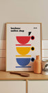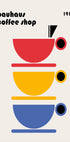 Un póster de cafetería inspirado en la Bauhaus de 1919 que presenta tres tazas apiladas en rojo, amarillo y azul en formas geométricas llamativas. Minimalista pero animado, este diseño expresa el espíritu artístico del modernismo y la cultura del café. Arte de pared perfecto para cocinas, cafeterías y amantes del estilo Bauhaus.