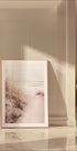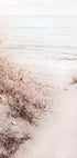 Una apacible fotografía costera que captura dunas de arena con hierba fina que descienden hasta la tranquila costa. Los suaves tonos beige y la expresión luminosa crean un ambiente tranquilo y natural, ideal para una decoración inspirada en la costa.
