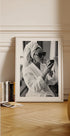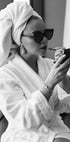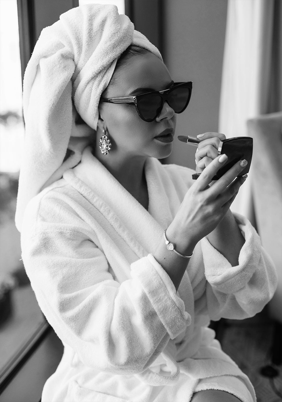 Una sofisticada fotografía en blanco y negro de una mujer en bata de baño con una toalla alrededor de la cabeza aplicándose lápiz labial, gafas de sol y joyas llamativas. Esta elegante obra de arte celebra la belleza de los pequeños rituales y el glamour atemporal, perfecta para interiores inspirados en la moda.