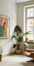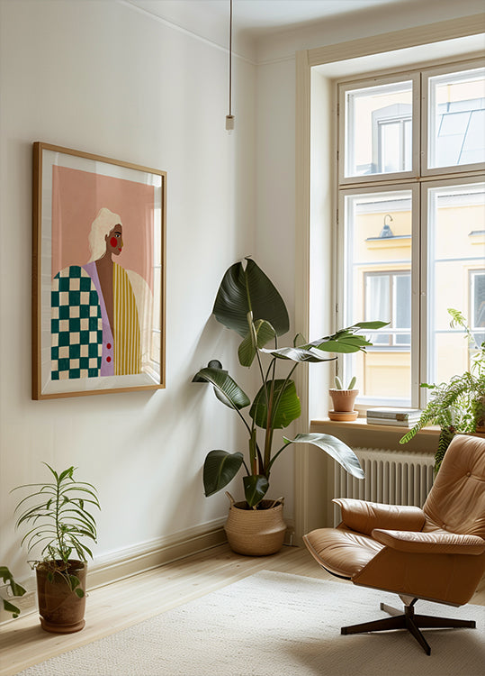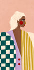 Esta obra de arte abstracta representa un retrato estilizado de una mujer con una atrevida blusa geométrica con colores vibrantes. La obra destaca el diseño moderno, el minimalismo y la expresión artística con formas expresivas sobre un fondo apagado, perfecto para los amantes del arte contemporáneo.