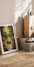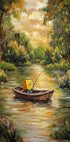 Una pieza de parodia humorística que combina el estilo clásico de paisaje de pintura al óleo con la cultura pop. La escena muestra a un personaje de dibujos animados pescando pacíficamente en un barco de madera rodeado de frondosos árboles y un río resplandeciente. Una mezcla divertida de naturaleza y humor surrealista, perfecta para los fanáticos del arte mural peculiar.