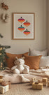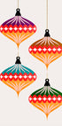 Una obra de arte navideña colorida y divertida con bolas navideñas geométricas en colores fuertes. Con formas abstractas y patrones festivos, el diseño aporta alegría y estilo moderno a la decoración de paredes de temporada, perfecto para celebraciones navideñas.