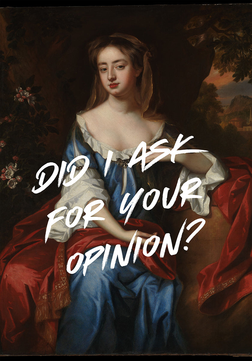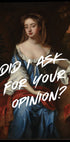 Este divertido cartel combina un refinado retrato barroco con un atrevido texto escrito a mano: “¿Te pedí tu opinión?”. La interacción de la elegancia vintage y la sátira moderna crea una declaración humorística y rebelde, perfecta para agregar personalidad y toque a cualquier pared.