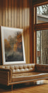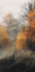 Un pintoresco bosque otoñal que desaparece en una suave niebla, con hojas brillantes de color naranja y ámbar superpuestas contra vetas gris verdosas apagadas. El estilo texturizado brinda una expresión soñadora y atmosférica que captura la tranquila transición del otoño. Un póster de naturaleza tranquila para una cálida pared de galería.