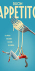Un póster colorido y divertido de inspiración italiana, que presenta una ilustración de una mujer balanceándose sobre hilos de pasta enrollados alrededor de un tenedor. Con el llamativo texto Buen apetito celebra la alegría de la comida italiana y su conmovedor confort, una mezcla de humor y estilo en una llamativa obra de arte.