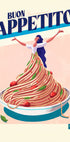 Un cartel alegre y juguetón de inspiración italiana con la llamativa frase Buen apetito. Muestra a una mujer cuyo vestido cae sobre una montaña de espaguetis con tomates y albahaca, una mezcla humorística de cultura gastronómica e ilustración en una animada obra de arte.