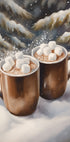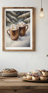 Una humeante taza de chocolate caliente con suaves malvaviscos reposa sobre un sencillo platillo, rodeada de escarcha invernal y un toque de copos de nieve en el aire. Los tonos apagados y acogedores capturan la sensación de los días fríos y las manos cálidas. Un motivo atmosférico de Andreas Magnusson, perfecto para la temporada navideña y de invierno en el hogar.