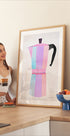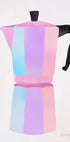 Una ilustración en colores pastel de una clásica olla de moca italiana, en suaves colores rosa, azul y lavanda sobre un fondo blanco minimalista. La pieza celebra los rituales matutinos y la cultura del café con un estilo fresco y moderno, perfecto para alegrar la cocina y agregar un toque divertido pero elegante.