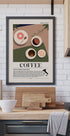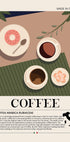 Un póster de inspiración italiana que muestra la silueta de tazas de café, un postre y terrones de azúcar sobre una mesa. El cartel destaca la historia y el proceso de producción del café centrándose en la tradición italiana del espresso. Perfecto para cafeterías, amantes del café y entusiastas de la cultura italiana.